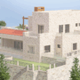 The façade is finished with light beige natural stone, arranged in a textured horizontal pattern that adds warmth, authenticity, and visual depth. This stone cladding pays homage to classic Levantine and Mediterranean architecture while maintaining a clean, contemporary appearance.